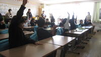 「先生が好きな給食の献立は?」と言うと、グループで話し合い1つの答えを紙に書きます。それを「せーの!」で見せて発表します。最後に「かぶっていいよ!先生の好きな献立は何ですか?」と声を合わせていいます。そして、先生が「好きな献立は、カレーライスです」などと答えを言って、自分たちが考えた答えと同じ時は「正解」となります。班で力を合わせて取り組むゲームで、大いに盛り上がっていました。(校長 佐藤 政臣)