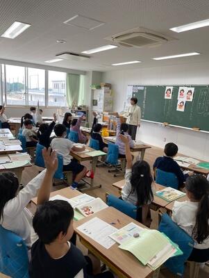 5年生は5年2組で外国語の授業を一緒に受けました。日髙教諭が本校と西合志第一小とで外国語の授業をしているので、いつものように授業を受けていました。