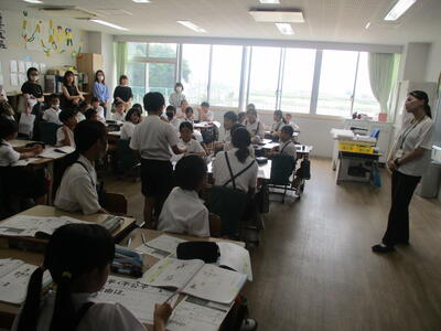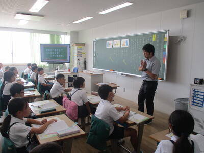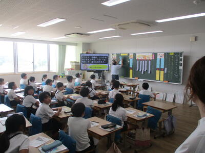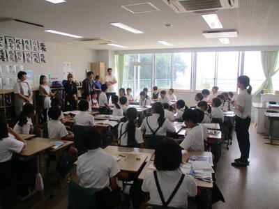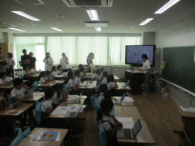 まず、校長、教頭、主幹、教務主任で学校の取組を説明した後、授業の様子を見られました。どの学級も落ち着いて授業を受けており、訪問された教育事務所の皆様も感心されていました。