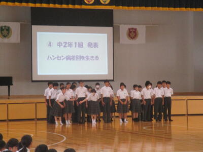 〇中学2年1組・・・「ハンセン病差別に生きる」と題したハンセン病問題学習。講師の中さんは、「正しい知識をひろめてほしい」と言われた。ハンセン病の学びから身近な差別をなくしていきたいと考え、クラスの現状と課題について考えたことを発表した。