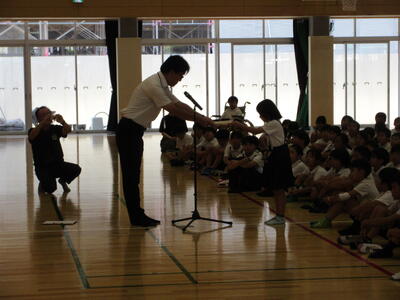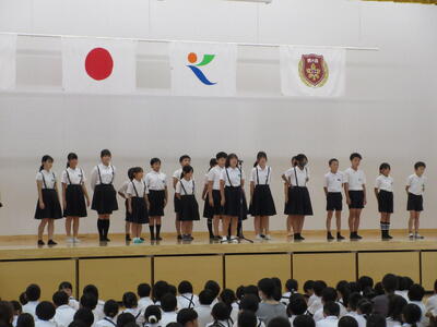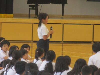 まず、あいさつ名人を表彰しました。あいさつ名人は、2年生の緒方あいかさんです。緒方さんは、毎日「立ち止まってあいさつができます」「自分から進んであいさつができます」そのようなことからあいさつ名人として表彰しました。その他の児童もあいさつが大変上手になってきました。これからも気持ちの良いあいさつができるようになりましょう。