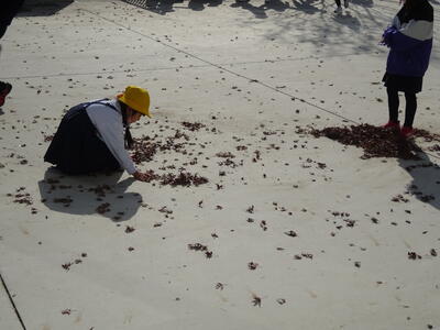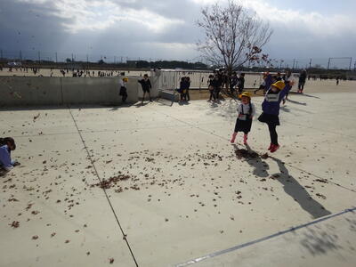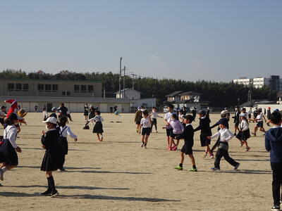 先週末からの日ごとに寒さがましていますが、子ども達は「寒さに負けず」に休み時間には、運動場で元気に遊んでいます。そうした中、先週の金曜日の昼休みには、シンボルツリーの楓の葉っぱを集めて遊んでいる1年生の子ども達の姿がありました。風に流されていく楓の葉っぱを追いかけたり、葉っぱを空高く投げたりして楽しんでいました。