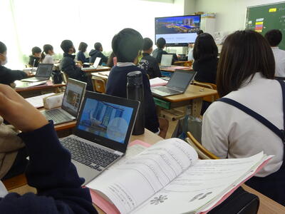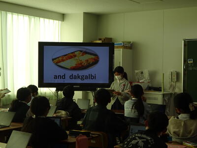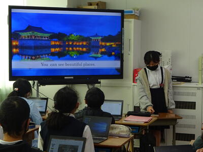 5年2組で岡田先生が外国語の授業(岡田先生は5年3組担任、同じ時間に2組は3組担任の杉本先生が家庭科の授業をしていました)をしていました。今回は、「プレゼンで自分のおすすめの国を紹介しよう」をテーマに、おすすめの国を選んでプレゼンテーションをつくり、それを英語で紹介していきます。