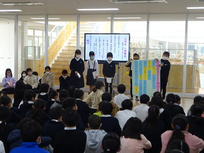 10月14日から始まった後期の前半が今日で終わりです。1時間目に冬休み前集会をオンラインで実施しました。発表では、1年2組の宮崎になさん、1年3組の坂井るかさん、4年3組の浪崎ときさん、5年2組の成田たけるさんが代表して発表をしてくれました。後期前半で頑張ったことや後期後半で取り組みたいことを発表してくれました。