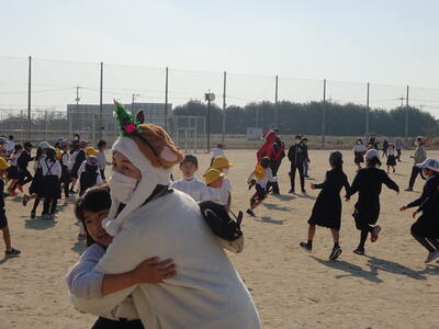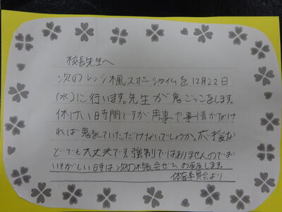 クリスマスも近いことから、先生方もそれぞれグッズを持ち寄り、サンタ、トナカイ、中にはスパイダーマンまで登場して子ども達も大喜び。いつの間にか、鬼が子ども達に追いかけられる?!(サンタのプレゼント袋の中身ををめがけて!)ハプニングもありましたが、冬休み前の楽しい昼休み時間を過ごしました。楓の森中HPでも紹介してもらいました。