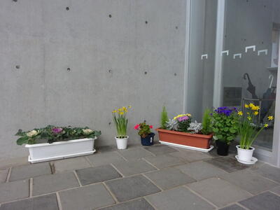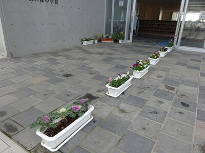 学校の北門からみんなの玄関までの通りは「こうしのみち」と名付けられています。この「こうしのみち」には、その季節に応じた花が植えられたプランターが置かれ、彩りを添えています。用務員の田尻先生が毎日、手入れをしてくれています。今は、みんなの玄関(北側)に、田尻先生が寄せ植えされた花々が来客者を迎えてくれています。