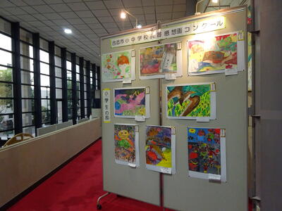 合志市内の小中学生が描いた「第16回合志市小中学校読書感想画コンクール」の入賞作品が、総合センターヴィーブルホールに展示されています。