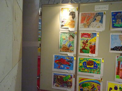 楓の森小からは金賞作品の1年生の清水りくとさん「バッタ、かっこいいな」、池田はやとさん「カメレオンのかぞくとにじ」、2年生の髙潮あやこさん「おいしそうなケーキができたよ」、3年生の清水さきなさん「ぐねぐねガリバー」、木佐木みなとさん「きんぎょ びじゅつかん」、4年生の村上きよかさん「カニたちの復讐」、5年生の大迫しょうたさん「セイちゃんが経験した神戸大空しゅう」、6年生の枦ほのかさん「ずっといっしょ」の8作品が展示されています。