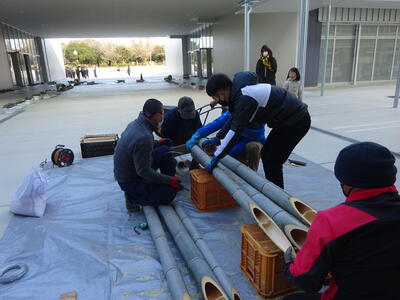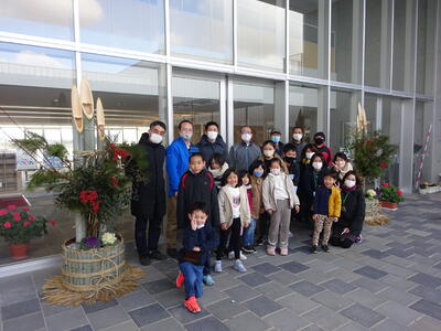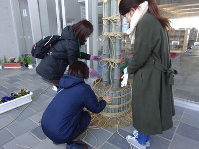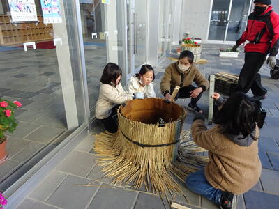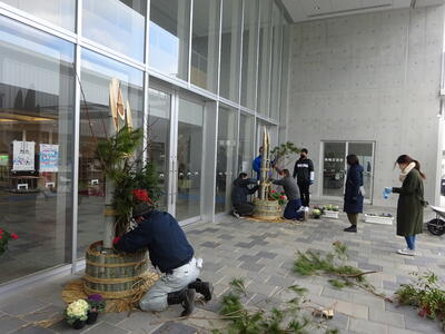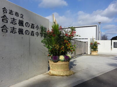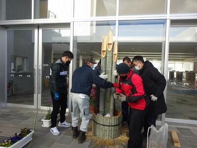 黒石原自治会の方々が、東門に門松を設置して頂きました。寒さの厳しい中、朝から準備と作業をして頂きました。楓での森中PTAと生徒会のみなさんが一緒に作業を手伝い、立派な門松ができあがっています。楓の森小PTAで、みんなの玄関に門松を設置し、楓の森小・中は2つの門松が置かれています。