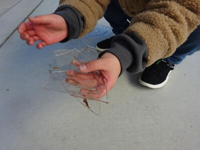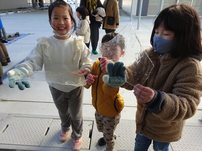 今日は今年一番の冷え込みとなりましたが、その中、9時からPTA役員の方々で門松づくりを行いました。子ども達もお手伝いに来てくれましたが、早速、運動場の水たまりの氷!を見つけて、大喜び。寒さの中、素手?!で持ってきて見せてくれました。楓の森小・中の初氷!です。
