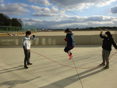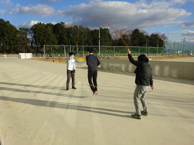 そんな中、職員室前の広場で、中村先生、岩田先生、山下さとし先生、寺田先生の4人がダブルダッチに挑戦していました。持久力やリズム感、バランスやチームワークが必要なダブルダッチ。今後、子どもたちと一緒に取り組めないか・・・とまずは先生方でチャレンジ。山下先生と寺田先生が二つのロープを回し、中村先生、岩田先生が跳び楽しんでいました。職員室からは音楽の山下いく子先生が「リズム感も必要」と音楽面からのアドバイスもありました。