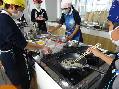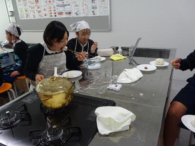 5年生の家庭科「食べて元気!ご飯とみそ汁」の授業で、ご飯を炊いておにぎりを作る実習を行っていました。今回は、炊飯器ではなく、耐熱容器のなべを使っての炊飯です。透明の容器のため、ご飯が炊き上がっていく様子も見ることでできます。慎重に火加減を調整しながらの炊飯。できたご飯でおにぎりを握り実食。どの班もおいしく炊き上がったようでした。日常では炊飯器があり便利ですが、災害時などのいざという時には、こうした家庭科での実習が生かされていくと思います。