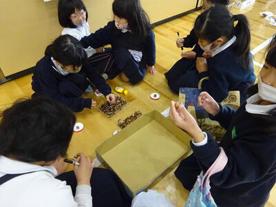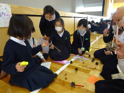 マラカス、やじろべえ、どんぐりごま、さかなつり、アクセサリー、まとあて、けんだま、ボーリングなど、色々なエリアがあり、来場した2年生や先生方も、1年生が行う遊び方の説明を聞いて、楽しいひとときを過ごしていました。中には、体育館内を呼び込みをしてまわる1年生もして、集客に貢献!していました。2年生は、マイバック持参で、1年生が作ったどんぐり人形やマラカスなどをお土産にもらい、大満足で帰ってました。