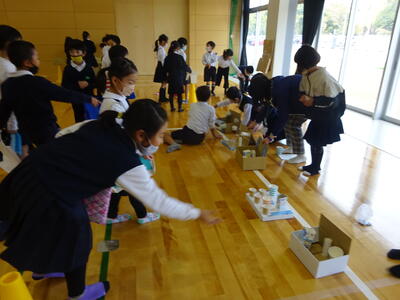1年生の生活科で学習し、計画・準備をすすめてきた「かえでのもり あきまつり」が3・4時間目に体育館で盛大に開催されました。1年生は、1時間目からそれぞれが準備してきた遊びのエリア(お店)の準備を行い、おまつりに備えていました。