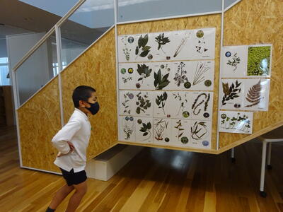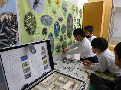 2年生や3年生の子ども達が、休み時間になると、「これなんだ?」「では問題です!」「やったー!」「あー」と言いあいながら、植物当てクイズが展示周辺で開催されています。子ども達は、遊びながら学んでいるようです。