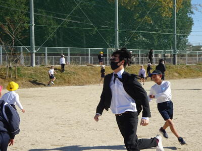 途中からは、黒いスーツにサングラスをかけた「ハンター」(後藤先生、岡田先生、宮田先生、山下先生、杉本先生)5体が登場し、子ども達は騒然となり、さらに逃げ回っていました。中には、ハンターに吸い寄せられていく子ども達もいるぐらい人気者のハンターでした。今回も思いっきり走り回り、体育委員会の目的は達成できたようです。