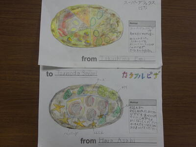 本ブログで以前紹介した4年生の外国語活動「What food do you like?」(11月15日ブログ) で、4年生の子ども達が先生方に好きな食べ物や具材を英語でインタビューをしながら学習を進めていました。その後、各クラスで学習が進んでいたようですが、ここ数日、インタビューをした具材を組み合わせて作ったオリジナルpizza(ピザ)ができあがり、それぞれに配達?!されています。毎日、子ども達た作ったおいしそうなピザが眺めて楽しんでいます。4年生の外国語を担当している森田商店(森田先生)は、楽しみながら英会話が増えているようです。