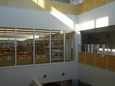 楓の森図書室の東側と西側は1階ロビーから3階までの吹き抜けとなっています。ここの吹き抜けに先日から「たれまく」がかけられています。たれまくを設置したのは、本校きってのアイディアの持ち主の図書司書の堀田先生。書かれているたれまくは「本の一斉返却期間中」「本の貸し出し開始」「中学校13日(月)」「小学校15日(水)」この吹き抜け箇所は、階段で上り下りする際に子ども達の目に入りやすい場所です。