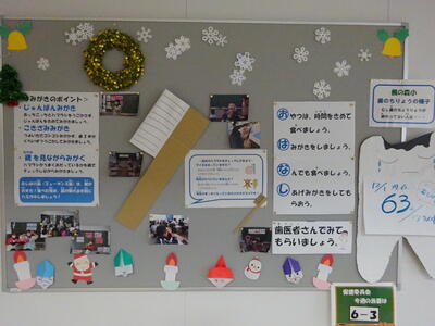 11月8日は「いい歯の日」から1か月。11月には保健室掲示板も歯に関する掲示が行われていました(11月8日ブログ「いい歯の日!」)。その後、菊池郡市歯科衛生士会の歯科衛生士の方々によるブラッシング指導なども行ってもらいました。現在の保健室掲示板は、ブラッシング指導でお話があった内容をクリスマスバージョンで紹介しています。