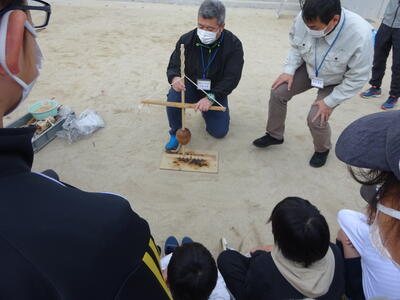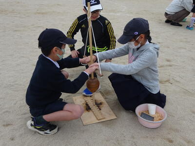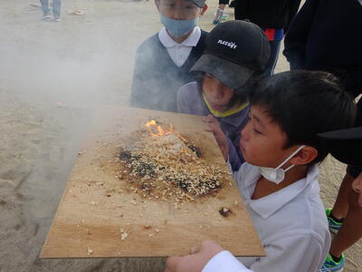 火起こしの歴史なども簡単に説明していただき、実際に「舞ぎり」を使っての火起こしにグループに分かれて体験しました。舞ぎりをリズムよく上下して「火だね」を作るまでが大変でしたが、子ども達はグループで声を掛け合いながら火だねを作っていました。火だねを「もぐさ」に移して安定させ、最後はおがくずをのせて、息を吹きかけて火をおこします。けむりに苦戦しながらも火がおこった瞬間には「わー」と歓声があちらこちらから上がっていました。