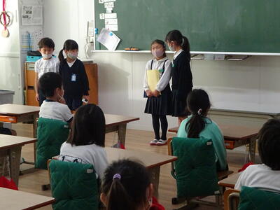 12月日に体育館で盛大に開催された1年生の「かえでのもり あきまつり」。招待された2年生も1年生のお店で楽しい時間を過ごしていました。今日の朝学活の時間には、2年生から1年生へのお礼のお手紙が1年生教室に届けられていました。
