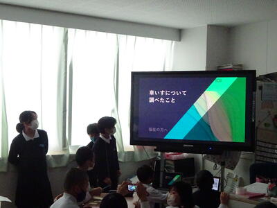 4年3組では、各班で調べてきたことの中間発表会が開かれました。「車椅子の種類や使い方、スポーツ用の車椅子」「耳が不自由な人の困っていること、手話と字幕」「合志市の盲導犬」「目の不自由な人のためのお店の工夫」「身のまわりのバリアフリー」などのテーマを新聞やポスター、パワーポイントなどでまとめての発表です。発表を聞いた子ども達からよかった点や改善点などをあげてもらい、改善して最終発表にのぞみます。