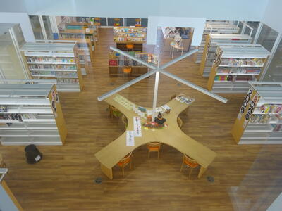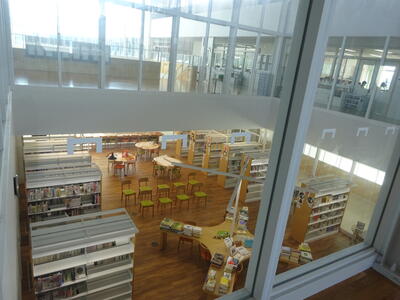 何度も紹介している合志楓の森小・中学校の図書室は2階にありますが、3階までの吹き抜けとなっており開放感があるつくりとなっています。3階の吹き抜け部分は、ガラス張りのため、3階フロアの廊下からも図書室を見ることができるちょっとオシャレな空間です。