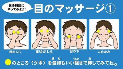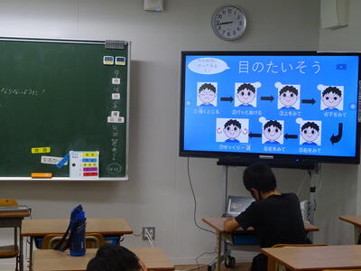 分散登校となり1週間がたちました。自宅でのオンライン学習では、タブレットを見ている時間がいつもより多くなっています。保健室の山下先生から、休み時間にできる目の体操スライドが紹介されています。早速、本日から各学年でも取り入れています。「分散登校 特設ページ」に詳細を掲示しています。
