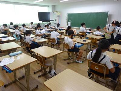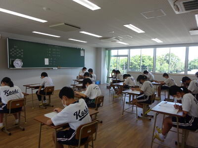 楓の森中学校は明日から3日間の期末テストが始まります。今回は全教科9教科で1日3教科ずつテストだそうです。現在は分散登校期間中ですが、テスト期間中は全員登校とし、教室を分散してテストを受検する形式をとられています。楓の森中は1・2年生のみのため、現在、空き教室となっている3年生の教室も使って実施されます(合志市内の中学校は全員登校の教室分散で実際されます)。