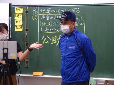 ゲストティーチャーは本校の米澤哲也教頭先生。子どもたちも「えっ」という表情でしたが、米澤教頭先生は、合志市の武蔵野台地域の「防災士」でもあります。