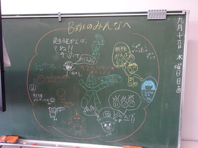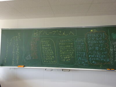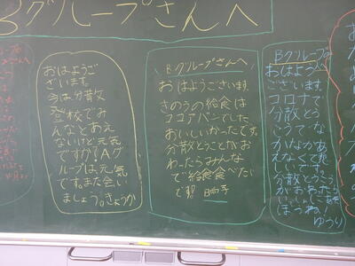 今日(16日)の朝、4年生の3組(中村先生)と4組(岩田先生)の教室を通りかかると、黒板には「Bグループさんへ」と題したメッセージが書かれていました。よく見ると、昨日(15日)が登校日だったAグループの子どもたちから、今日(16日)登校のBグループの子どもたちへのメッセージでした。