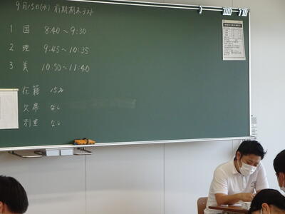 楓の森中学校では今日から3日間の期末テストが始まりました。分散登校期間中ですが、テスト期間の3日間とテスト返しの2日間の計5日間は、全員登校となります。1教室の人数を半分にして蜜をさけるため、現在使われていない3年教室や美術室などの特別教室も使っての感染防止対策バージョンの期末テストとなっています。