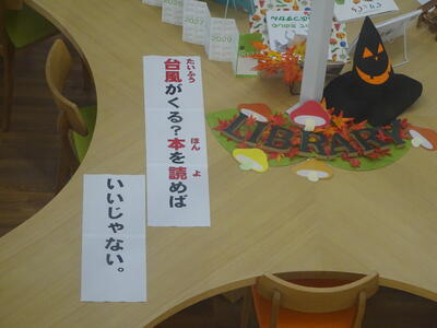 これから台風の季節となりますが、楓の森小・中の図書室には「台風がくる?本を読めばいいじゃない」の名言が・・・。確かに。こんな時は読書です。