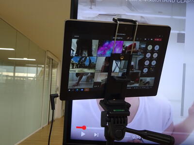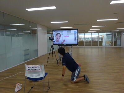 今日の3時間目。3年生教室横にある広い多目的室で、3年2組担任の山下先生がぽつんと一人で何かをされていました。よく見るとオンラインで自宅の子どもたちに向けた体育の授業中。タブレットの画面ごしにうつっている自宅学習の子どもたちも山下先生の指示にしたがい、ストレッチをしていました。