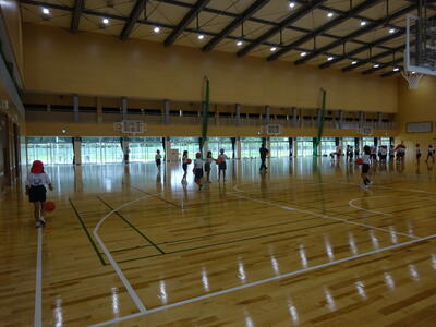 登校している3年生は・・・・と体育館でボールを使った運動が行われていました。1組の田川先生と3組の金澤先生が対面での授業。次の登校時にこの活動が入れ替わることになります。