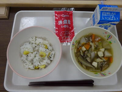 今日は、3週間ぶりのごはん(栗ご飯)でした。久しぶりのごはんの給食に喜んだ子どもたちも多かったようです。もちろん、職員も喜んでいました。現在は、分散登校期間中のため、Aグループ、Bグループがごはんの日が同じ回数になるように調整しています。連休明け登校のBグループさんも火曜日はごはんの日です。楽しみに。