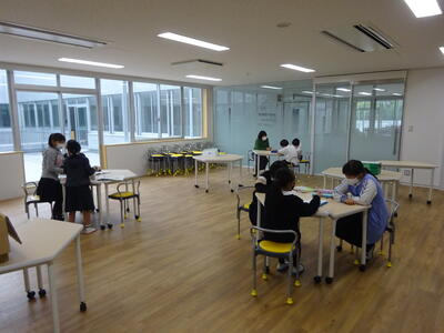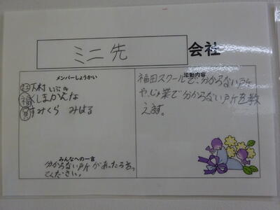 昼休みの小多目的室で勉強をしている数名がいました。中には4年1組の福田先生の姿もあります。福田先生に話を聞くと、会社活動(子ども達の自主活動の一つ)で、「ミニ先生会社」があり、この会社の経営内容は「福田スクールで、分からない所や授業で分からない所を教えます」とのこと。