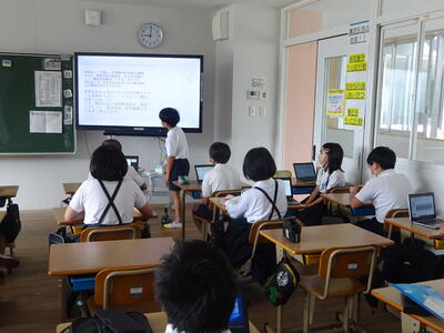 総合的な学習の時間で、5年生は水俣学習を行ってきています。学習の中で環境問題について、子どもたちがそれぞれのテーマで調べ学習を進めてきました。現在、調べたことをタブレットでプレゼンとしてまとめ、クラス内で発表しています。4年生の時から、タブレットでプレゼンを作成することは何度か経験していますが、5年生になり、プレゼンの枚数も増え、内容もさらに充実していていました。今日は、5年1組で発表があっていましたが、体験談なども交えた発表も盛り込むなど、より説得力のあるものに仕上がっている子どももいて驚かされました。