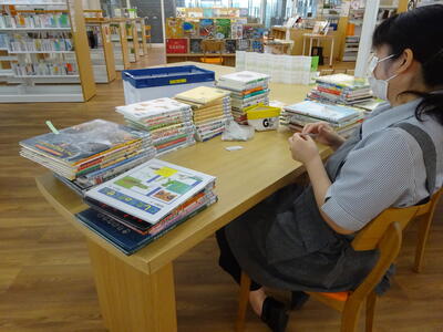 感染防止対策のため利用を制限している図書室ですが、司書の堀田先生は毎日、図書室にこもり作業をされています。4月開校時の蔵書数は5731冊(現在は6516冊。うち寄贈本は129冊)。4月当初、子どもたちができるだけ早く図書室を利用できるようにと急ピッチで準備、整理、環境づくりをされていました。しかし、堀田先生一人でするには限界もあったようで、この利用制限期間を使って様々な作業を黙々と行われています。図書室利用が再開した時には、子どもたちにとってもさらに利用しやすいリニューアルしたものになっていると思います。