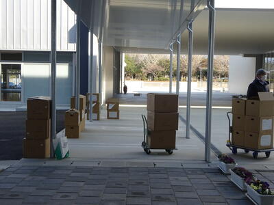みんなの玄関に運ばれてきた多数の段ボール箱、中身は新小学1年生用と中学校の追加分(不足分)のタブレットでした。