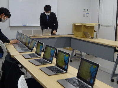 市内の全児童生徒に市から貸与されている一人一台のタブレットは、中学校卒業まで同じタブレットを使っていきます(中学校3年生が使っていたタブレットを小学校の新1年生が使うことになります)。合志楓の森中学校は現在3年生がいないため、本校の新1年生については新たに150台ほどのタブレットが入れて頂きました。本校の他にも他市町村からの転入生用のタブレットも他の小・中学校には納品されたとのことでした。
