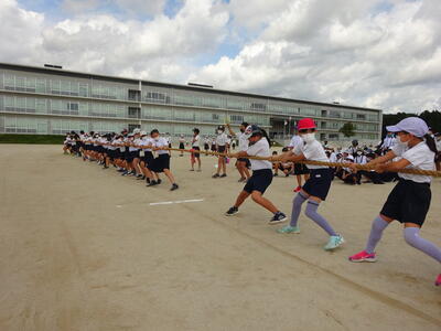 3・4年生では、つなひき経験者は、1・2年生に比べるとさらに減ってクラスで10人程度。それでもさすが中学年だけあって、力強さが違います。どの対戦も拮抗したものになり、見ている側も力が入りました。担任の先生方も思わず加わって大いに盛り上がりました。