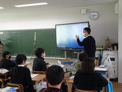 6年1組の社会科の授業が行われていて、米澤教頭先生がゲストティーチャーとして招かれていました。学習内容は、「世界の未来と日本の役割」で国際協力の内容でした。