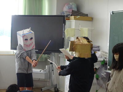 今のクラスでの生活も残り1日となり、各学年やクラスで、子ども達が企画したお楽しみ会などが開かれます。5年1組をのぞくと劇団?!による「ももたろう」の演劇があっていました。台本、小道具、大道具まで劇団員?!で準備をしたとのことで、おもわず見入ってしまう演劇でした。休み時間などを使って作ったという桃太郎の兜やよろいも段ボールで作られておりなかなかのクオリティーです。5年生は、芸能の才能あふれる子ども達が多く見られ楽しませてくれます。