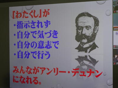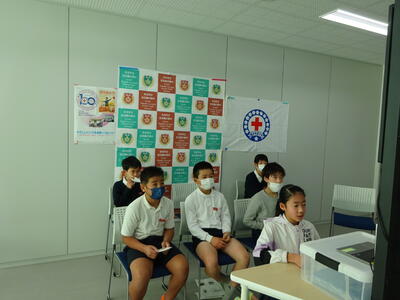 プログラム1では「赤十字と青少年赤十字について」説明を聞き、青少年赤十字について学びました。日本赤十字社は熊本が発祥の地ということを初めて知り、また、青少年赤十字の目的「〇奉仕(しんせつ)〇健康・安全(いのちとけんこう)〇国際理解・親善(なかよく)」や目標「気づき・考え・実行する」など、自分達の学校生活や暮らしを重ねあわせながら、子ども達は聞いていました。