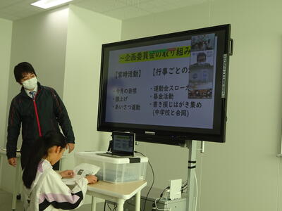 プログラム2では、今回参加した合志楓の森小を含む5校(熊本市立楡木小学校、熊本市立富合小学校、芦北町立大野小学校、津奈木町立津奈木小学校)の学校紹介を行いました。他の小学校の特色や児童会の取組などを聞き、また、お互いに質問をしながら交流を深めました。