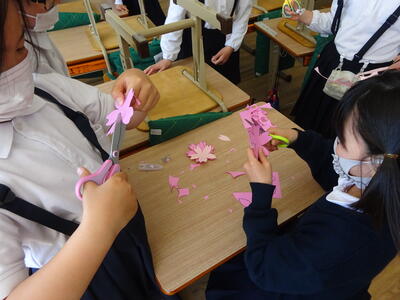先週から休み時間や昼休みの1年生教室では、飾り付け用の輪っかを作ったり、サクラの形を切ったりしている子ども達がいます。「何をしているの?」と尋ねると、「新しい1年生の教室の飾りをつくっている!!」とニコニコ笑顔で答えてくれます。