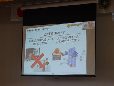 今回は、e-ネットキャラバンの講師の方がスライドを使って分かりやすくお話をしてくれました。私達の生活にはなくてなならないものとなったインターネットとのよりよいつきあい方をするために、まずは、7つの「きけん」について話がありました。①ネット依存 ②ネットいじめ ③あらしい情報の拡散 ④さそい出し・なりすまし ⑤個人情報 ⑥ネット詐欺 ⑦著作権・肖像権について、子ども達の身近な話題をもとに説明がありました。うなずきながら聞いている子どもの多く、実際にネット社会で体験している子どももいたようです。