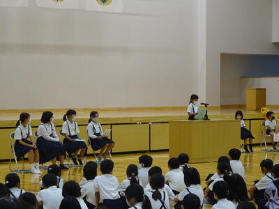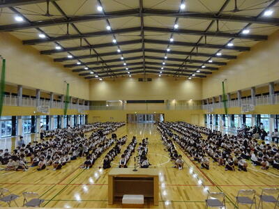 事前に小中の教務主任で計画されたこともありましたが、子ども達は、無言のままスムーズに体育館に入場するなど、初めての集会とは思えないほどで、日々の学校生活で培われた成果だなと感じました。