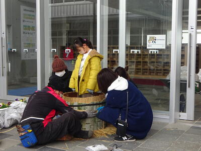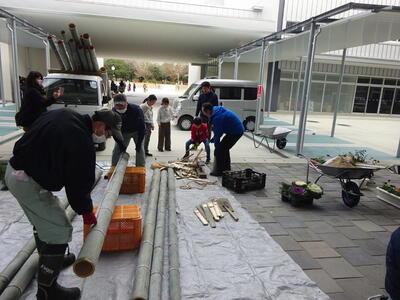 昨年度もお世話になった合志市PTAのOBの野田さん、合志南小地域コーディネーターの上野さん、酒井さんに指南いただきながら、PTA役員の方々と門松づくりを朝9時から行いました。ちょうど一年前も行った経験を思い出しながらでしたが、PTA役員の皆さんも経験者?だけあって、今年は段取りもよく、2m50㎝ほどの大きな門松をみんなの玄関前(北側)に設置しました。明日は、黒石原自治会の方々が東門にも門松を作っていただく予定です。